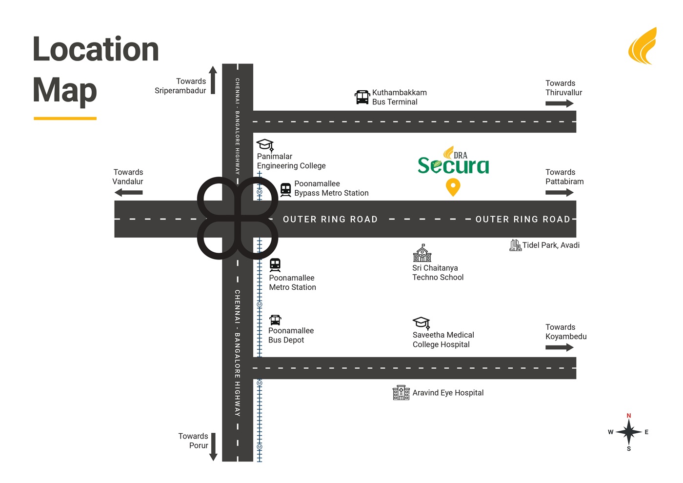 Poonamallee is a major western suburb and a crucial nodal point for connectivity to and from Chennai. DRA Secura's location on the Poonamallee Trunk Road (NH-48) places it at the heart of this network.